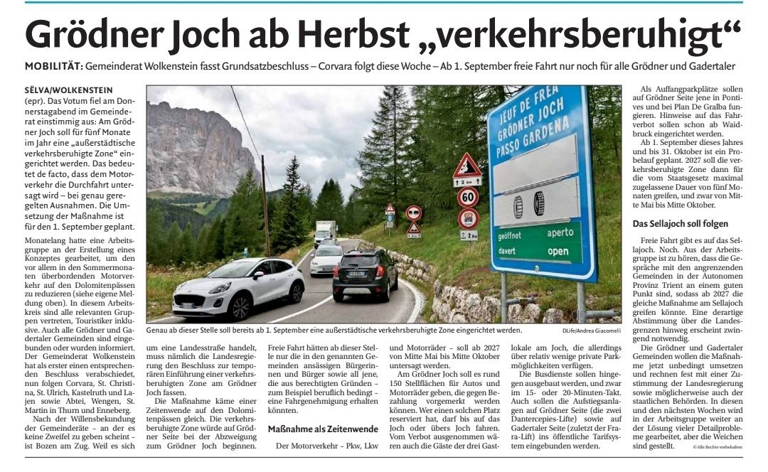 Bereits vollständig ausgearbeitet wurde das Konzept von einer technischen Arbeitsgruppe. Bevor die Regelung in Kraft treten kann, ist jedoch noch die Zustimmung der Südtiroler Landesregierung erforderlich, da das Grödner Joch eine Provinzstraße ist. Die Maßnahme steht zudem nicht allein, sondern gehört zu mehreren Ansätzen, mit denen dem zunehmenden Tourismusdruck in der Alpenregion begegnet werden soll.